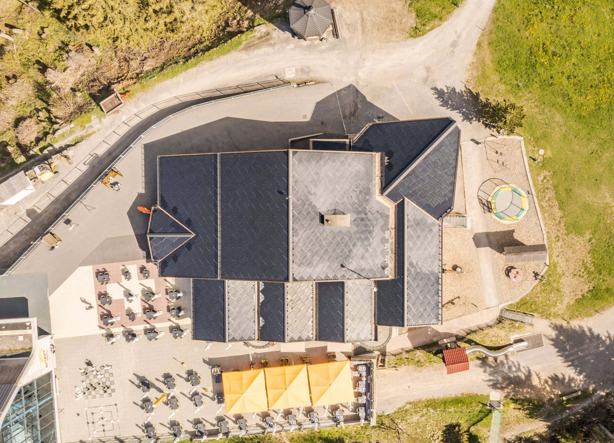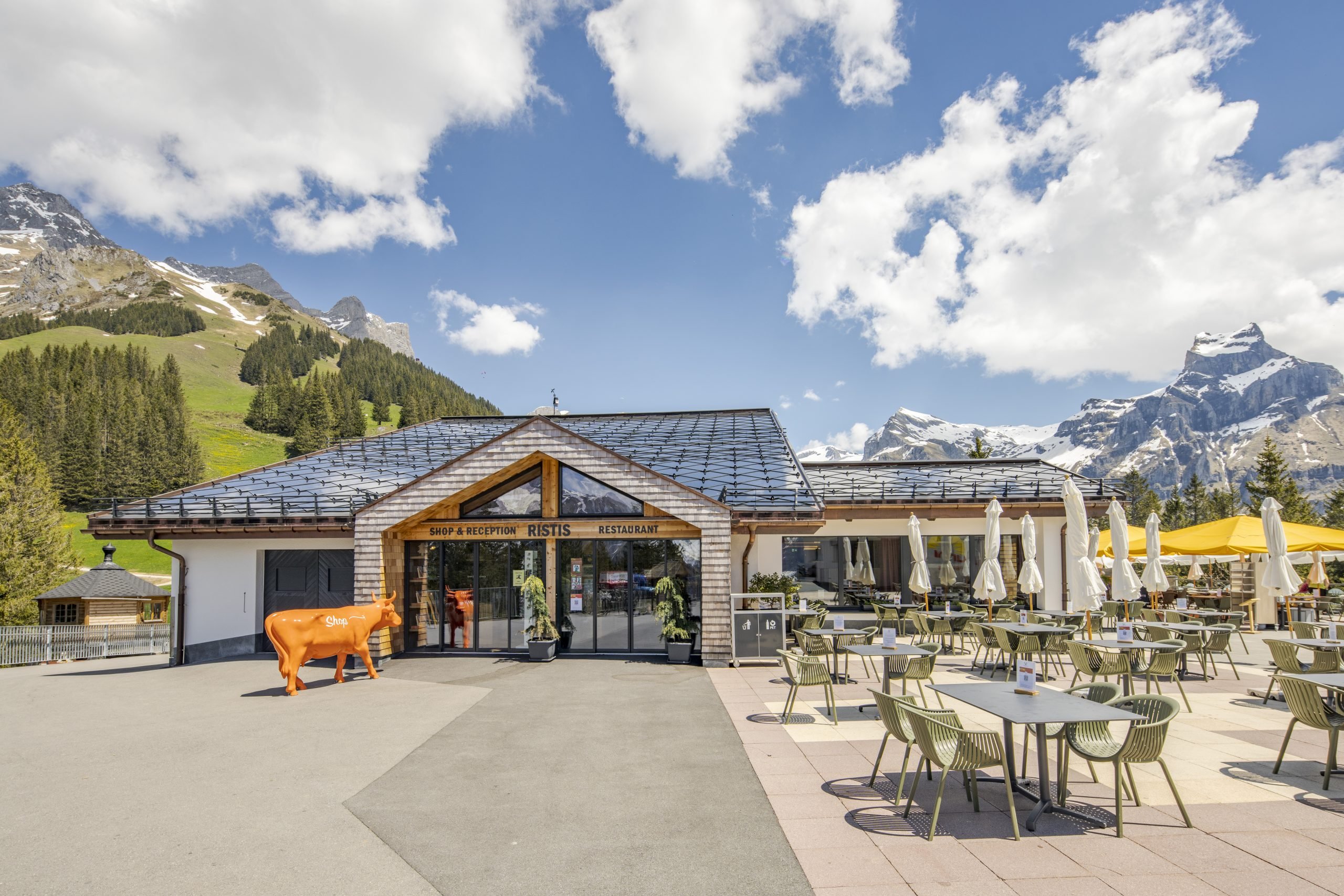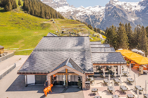 Neben dem Restaurant Ristis, dessen Dach vollständig mit SunStyle-Solarziegeln bedeckt ist, ist auch das Dach der ehemaligen Bergstation mit Photovoltaikmodulen ausgestattet. Das Bergdorf verfügt also über ein eigenes Sonnenkraftwerk, mit dem es Kunstschnee für das gesamte Skigebiet produzieren kann! Ein „sauberer“ Schnee ohne Co2-Emissionen, der nur aus Wasser und Sonnenenergie hergestellt wird.