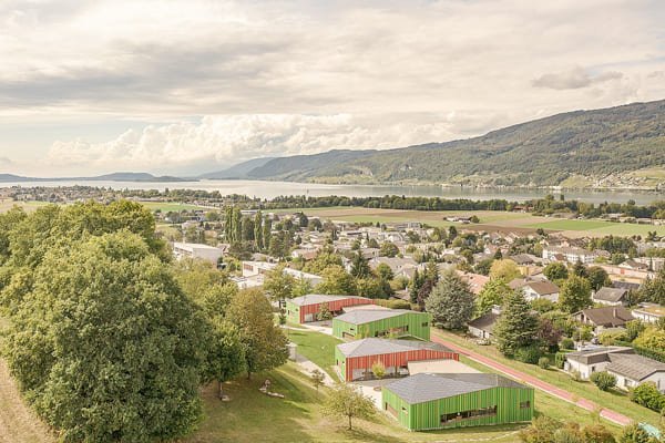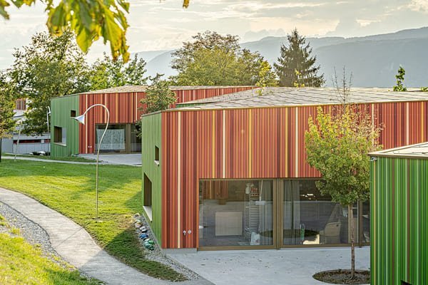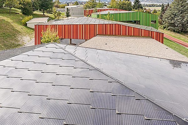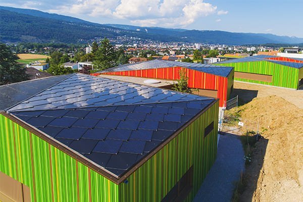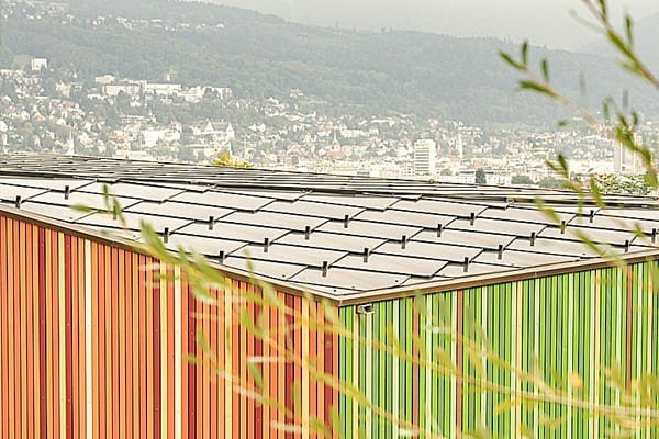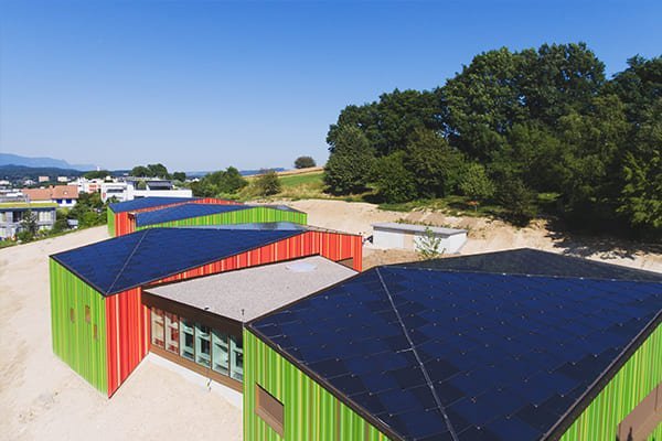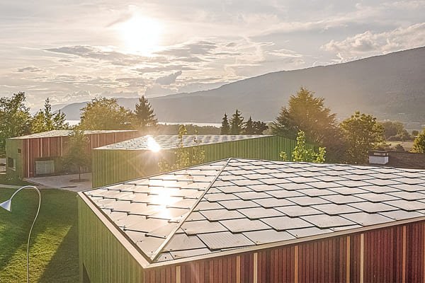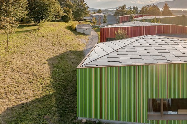 Das Holzgebäude steht auf einem Betonsockel. Das sanft geneigte Dach ist mit SunStyle-Solarziegeln bedeckt. Das Gebäude wurde nach dem Minergie-P-Eco-Standard mit einem Photovoltaik-Dachsystem, Massivholz, Schweizer Holz, FSC und HSH gebaut.