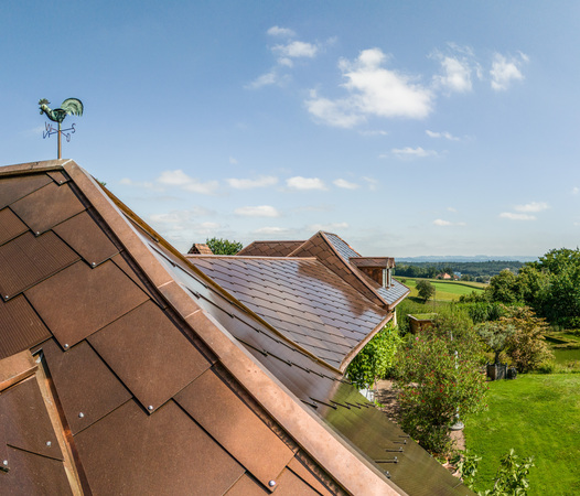 In Lüterkofen, the roof covers approximately 660 m2 and features 840 solar tiles, generating a capacity of 60 kWp. This PV system will yield an estimated 50,000 kWh of energy per year, significantly decreasing the homeowner’s dependence on external energy sources.